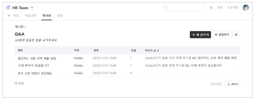 프로젝트 단위로 여러 개의 게시판을 추가할 수 있으며, 커뮤니케이션 용도로 사용할 수 있습니다.