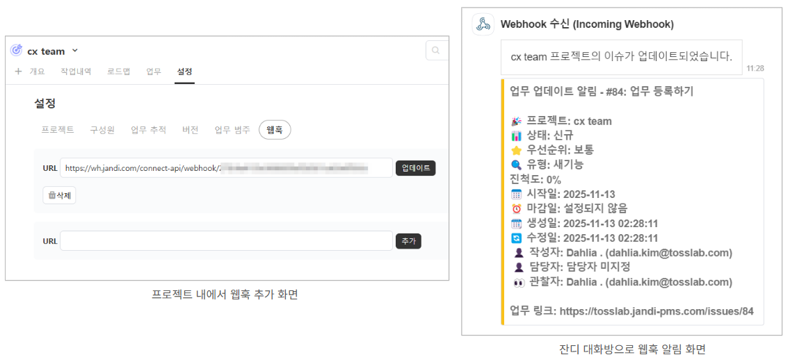 업무 등록 및 수정 사항에 대한 알림을 Outgoing Webhook으로 내보낼 수 있습니다.