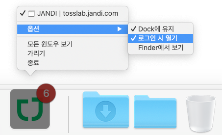 1. Dock에 위치한 잔디 아이콘을 오른쪽 클릭해 [옵션] - [로그인 시 열기] 를 체크합니다.