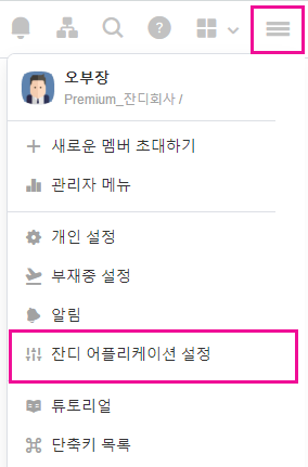 1. 잔디 화면 상단에 있는 [≡] - [잔디 어플리케이션 설정]을 선택해주세요.