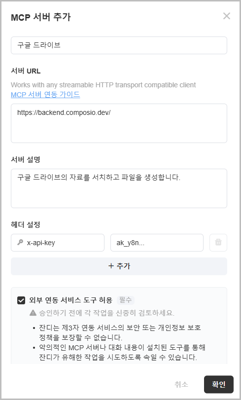 MCP 서버 추가는 사용자가 내용을 충분히 확인하고 승인한 후 연결 가능하며, 승인 후 발생하는 작업에 대해서는 JANDI에서 책임지지 않습니다.