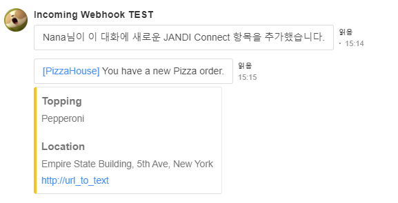 curl \ -X POST https://wh.jandi.com/connect-api/webhook/생성한-웹훅-주소 \ -H "Accept: application/vnd.tosslab.jandi-v2+json" \ -H "Content-Type: application/json" \ --data-binary '{"body":"[[PizzaHouse]](http://url_to_text) You have a new Pizza order.","connectColor":"#FAC11B","connectInfo":[{"title":"Topping","description":"Pepperoni"}, {"title":"Location","description":"Empire State Building, 5th Ave, New York","imageUrl":"Url_to_text"}]}'