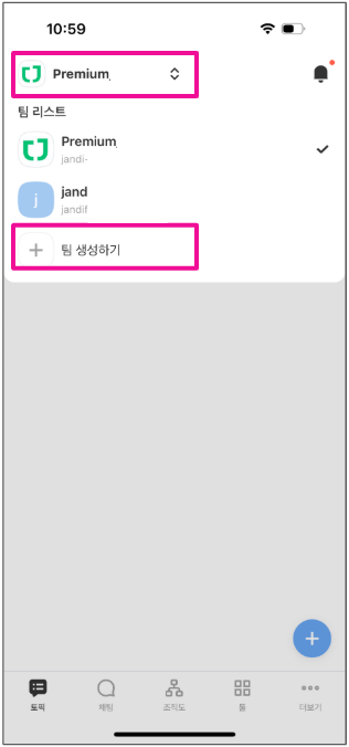 1. 화면 상단 [팀 이름]을 터치 후 표시되는 메뉴 패널에서 [+팀 생성하기] 버튼을 터치해주세요.