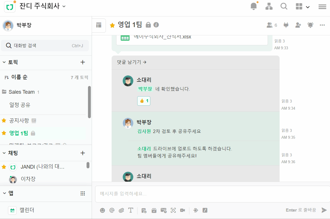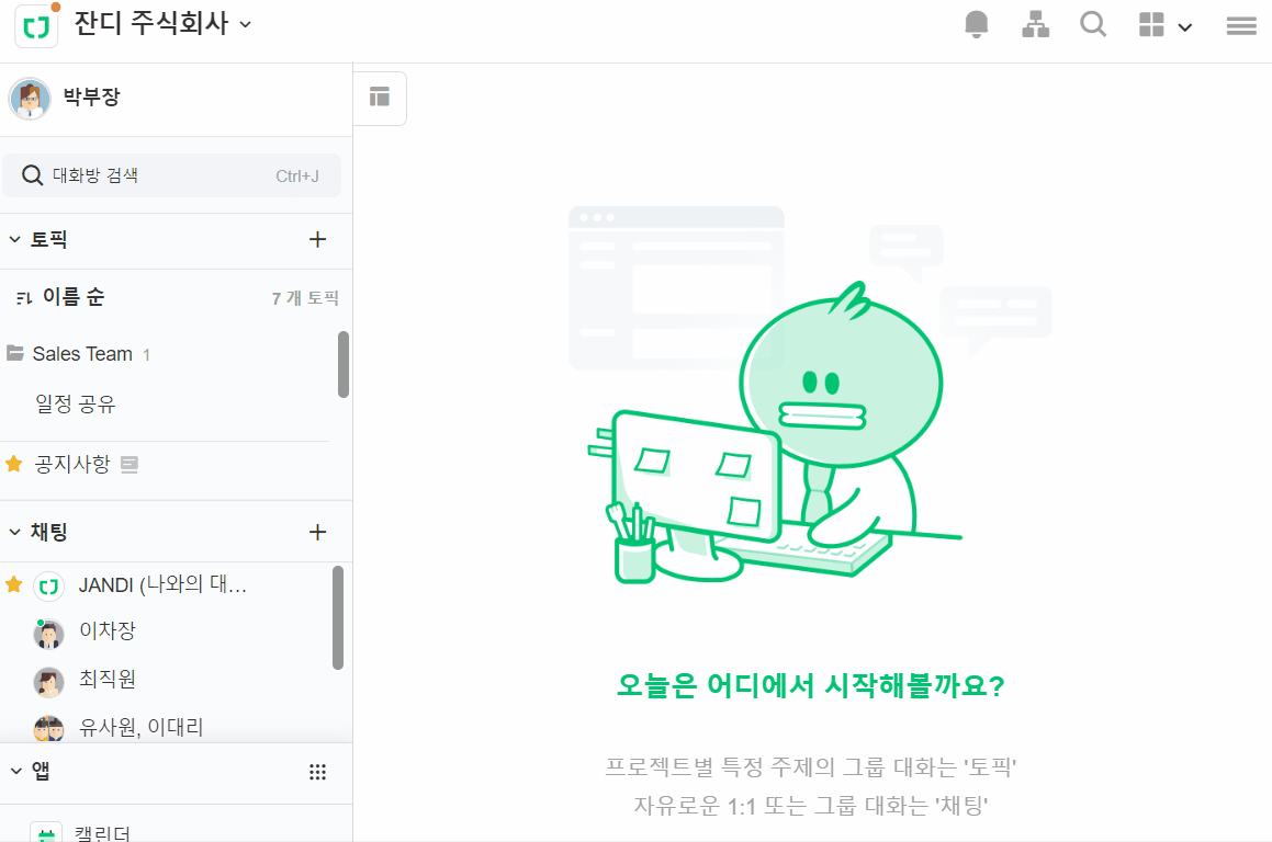 • 잔디 홈으로 이동하여 생성형 AI기능 및 안 읽은 메시지 요약하기, 최근 대화방 가기, 오늘의 일정, 오늘의 할 일을 확인하실 수 있습니다.