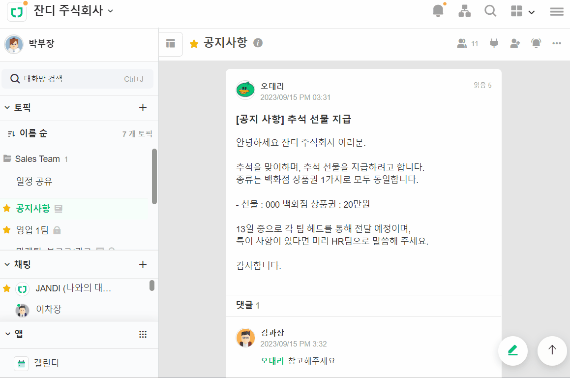 이미 알림이 와있는 토픽에 들어가기 위해서는 Ctrl(Cmd) + J를 누른 후 키보드 방향키로 선택한 다음 Enter 키를 누르면 바로 토픽에 진입하여 메시지를 입력할 수 있습니다.
