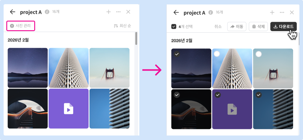 선택 다운로드 : 좌측 상단 [사진 관리] > 파일 선택 > [다운로드]