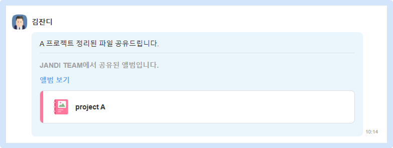 공유된 앨범은 메시지 형태로 공유되며, 해당 대화방에 참여 중인 멤버만 확인할 수 있습니다.