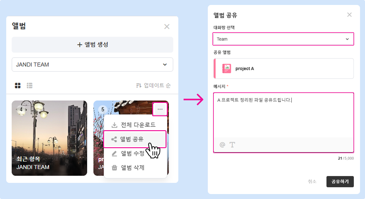 앨범에 마우스를 올린 뒤 [...] > 앨범 공유 > 대화방 선택 및 메시지 작성 > [공유하기]