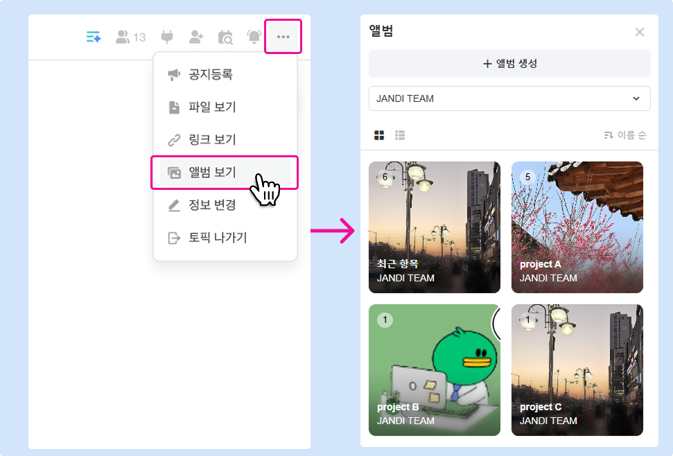 대화방 (토픽/채팅)내 우측 상단 ...(더보기) > [앨범 보기]