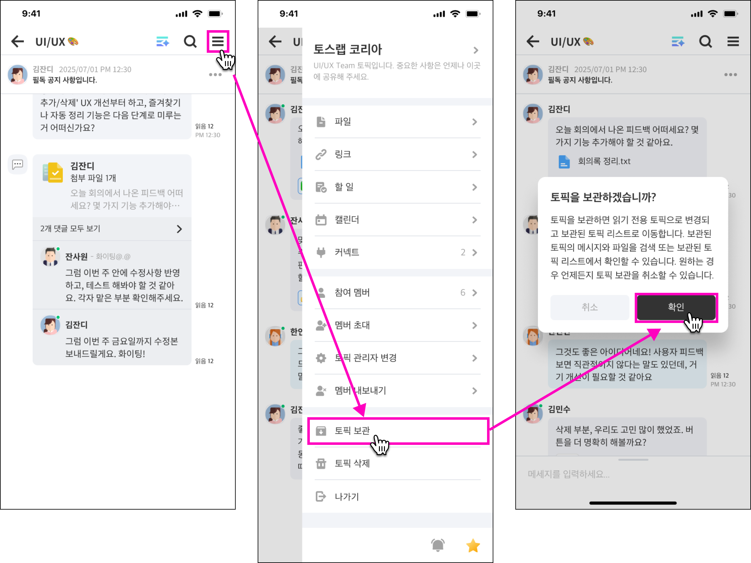 토픽 보관 기능으로 사용하지 않는 토픽을 숨겨 깔끔하게 정리하고, 필요할 때 보관된 토픽 폴더에서 언제든 확인할 수 있습니다.