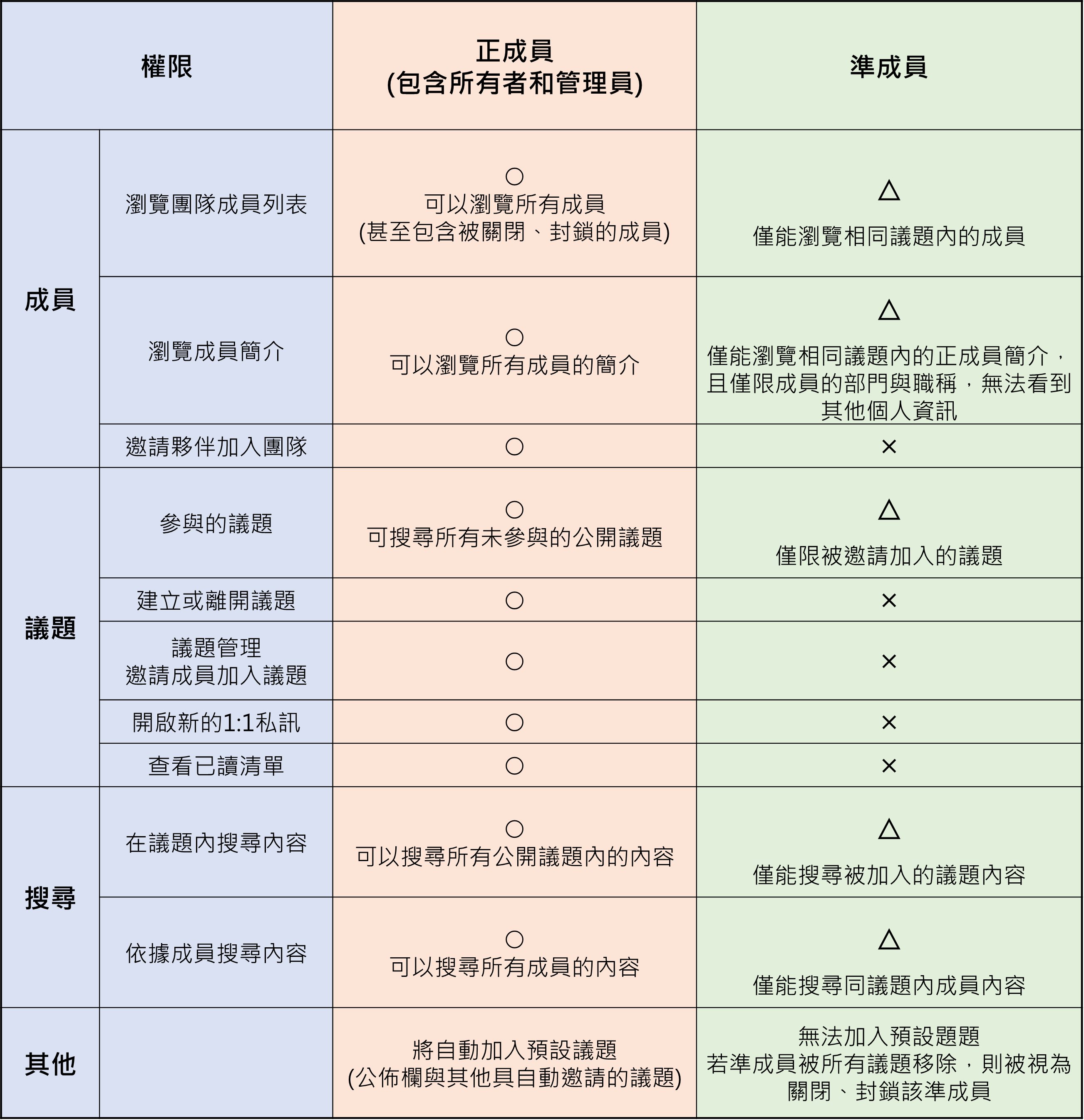 準成員:功能受限之成員權限,適用於外部協作人員、兼職、廠商等對象