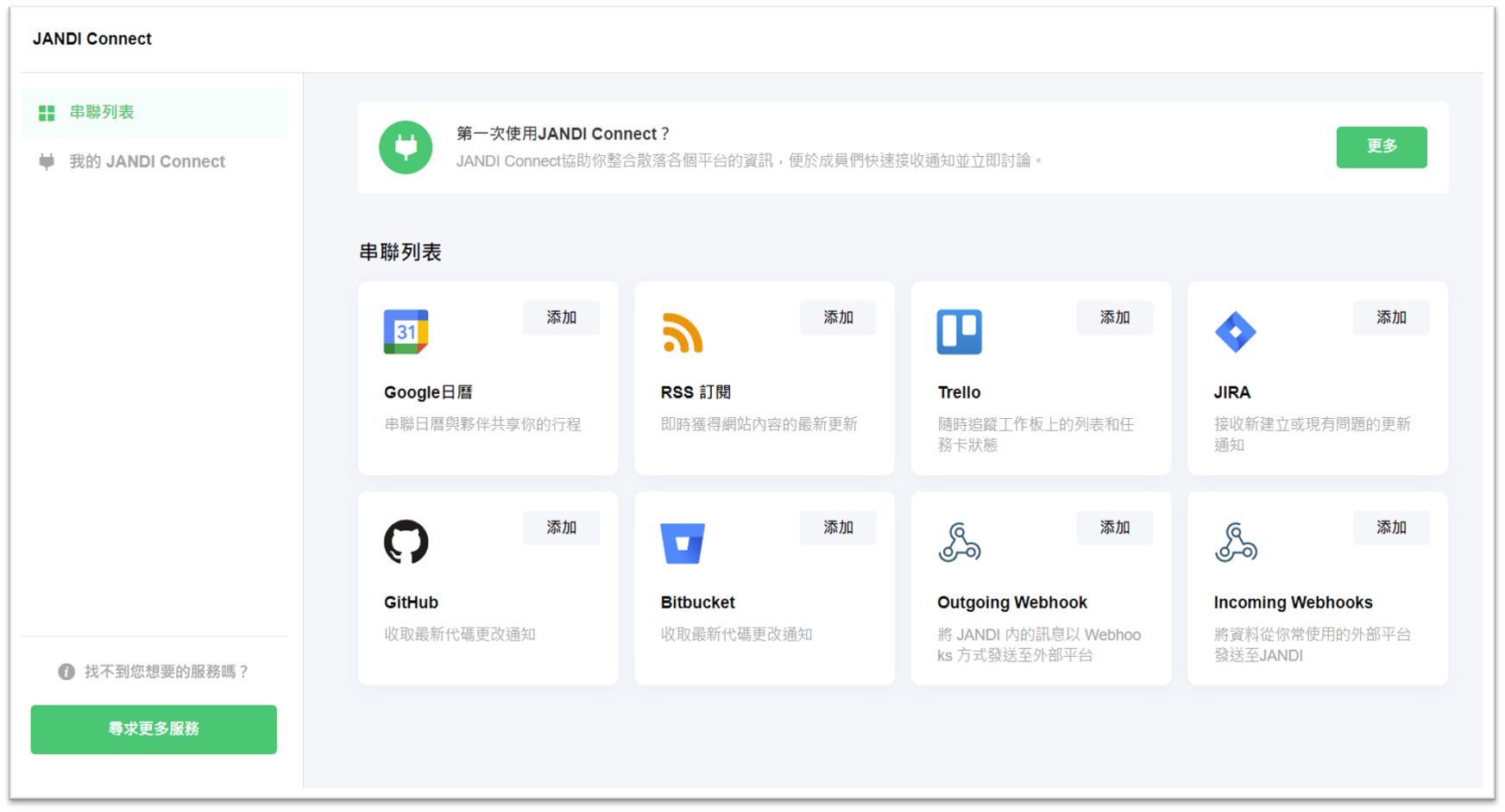 目前,JANDI 可串聯於 Google 日曆、RSS 訂閱、Trello、JIRA、GitHub、Bitbucket 及 Incoming/Outgoing Webhooks