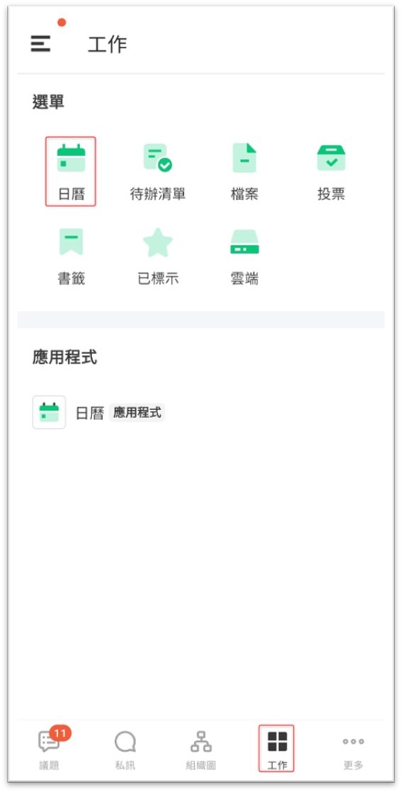 以登入 JANDI 狀態下,在介面下方的 [工作] 選單中或應用程式中皆可進入 JANDI 日曆。