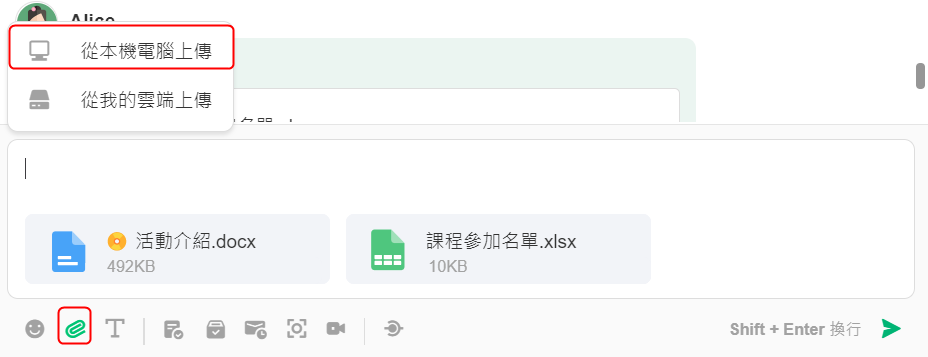 在訊息輸入框點擊 [檔案] 圖示,選擇 [從本機電腦上傳] 即可上傳。