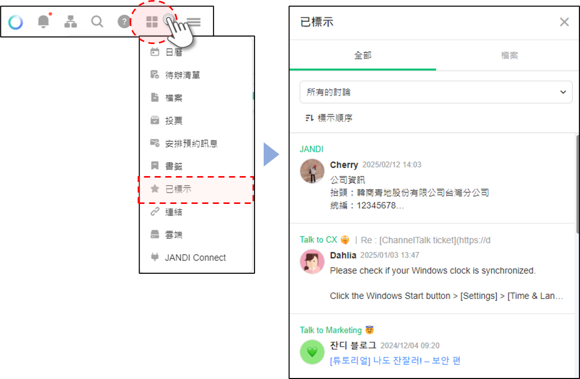 點擊 JANDI 介面右上角四個方塊 [選單] > 選擇 [已標示]。