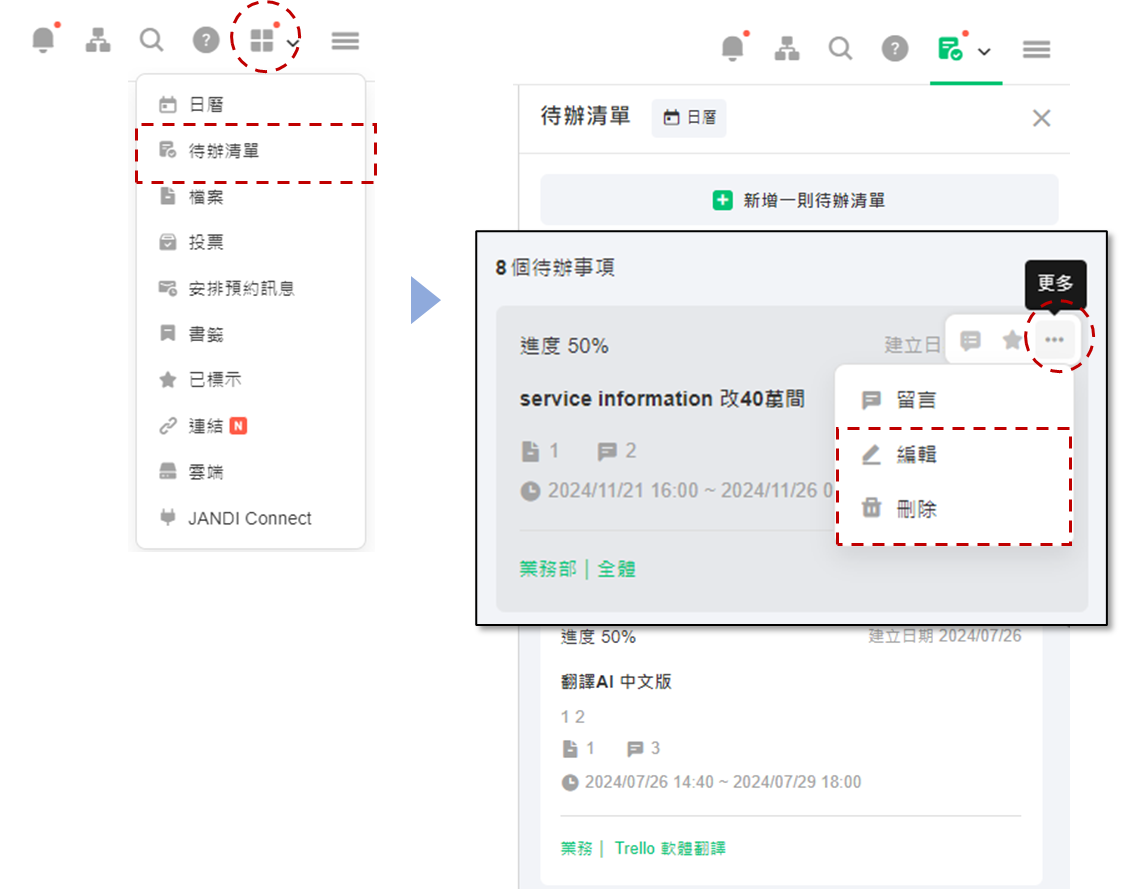 JANDI 右上角,四格方塊處 [選單] > 待辦事項