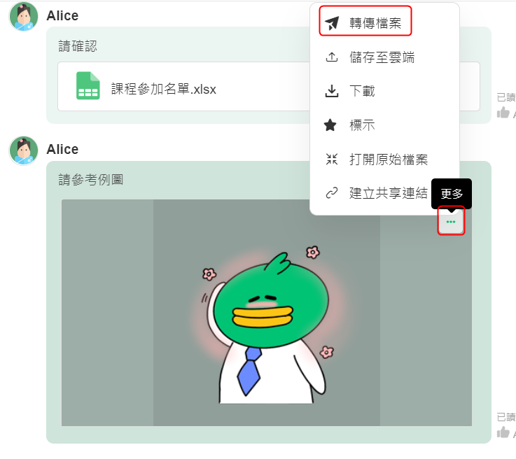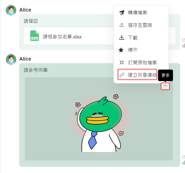 1. 點擊檔案訊息後的 [...],並選擇 [分享]。