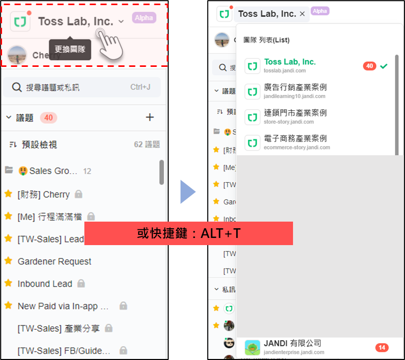一個成員可加入多個 JANDI 團隊多團隊操作範例您可以同時加入多個 JANDI 團隊,例如:公司團隊:A 公司興趣社團:登山社專案合作:客戶協作團隊JANDI 支援您在不同團隊間自由切換,滿足多元溝通與協作需求。如何切換團隊?PC / WEB操作方式:點擊左上角團隊名稱 > [更換團隊]。- 或快捷鍵:Alt + TMobile點擊介面左上角的 [≡],選擇其他團隊名稱。