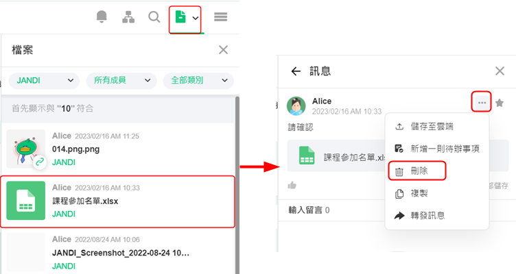 ✔️在檔案列表中,您可以清楚地看到每個聊天室所有檔案,您可以透過點擊檔案來刪除。