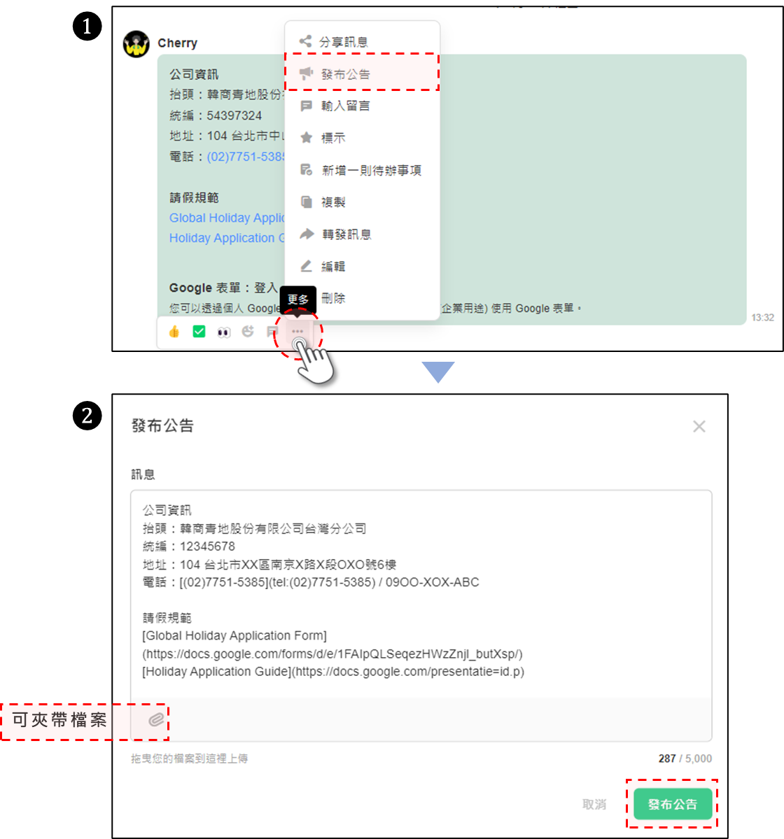 將滑鼠懸停於訊息上,點擊 [...更多] > [發布公告]