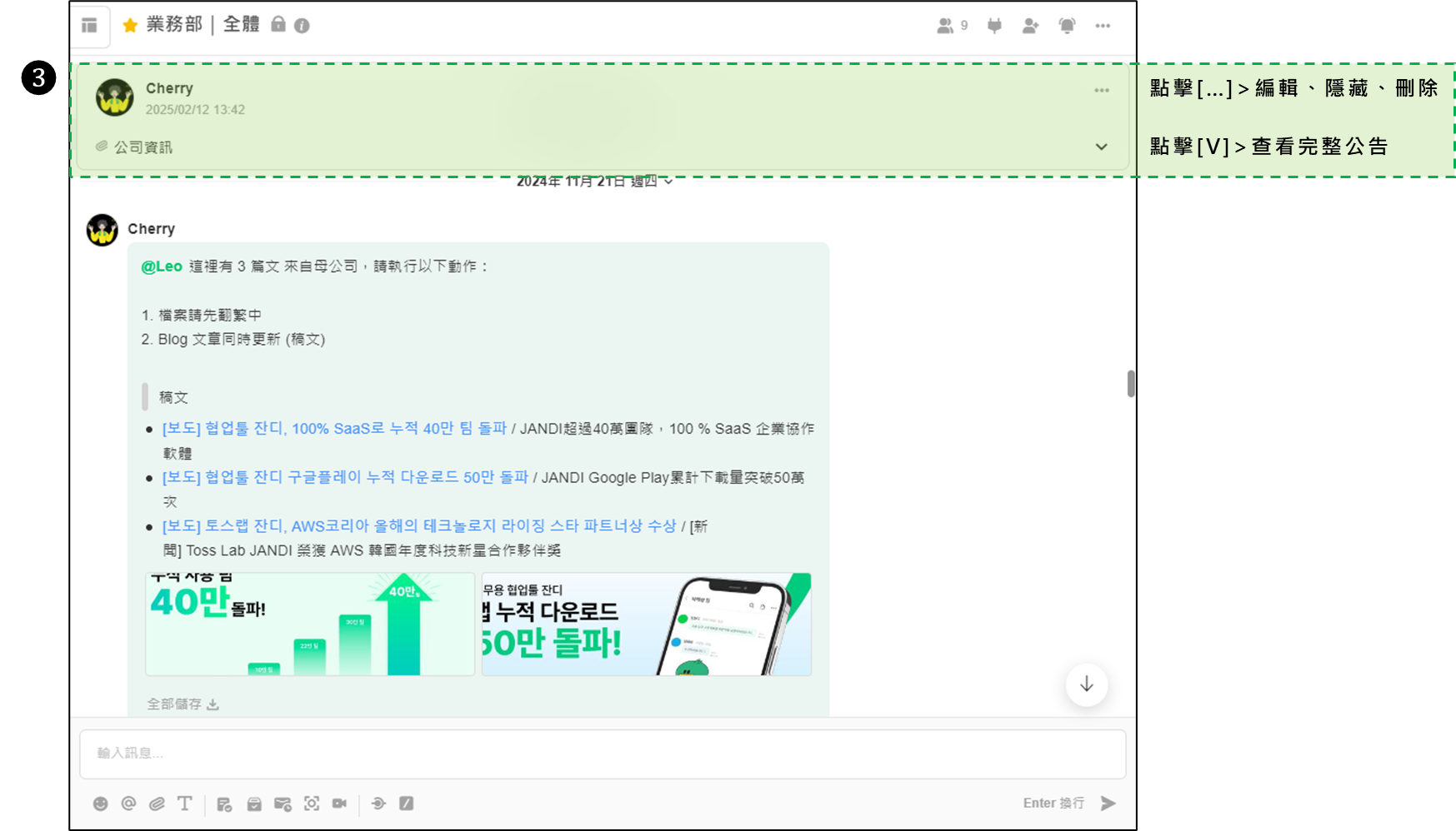在議題內,可以將特定訊息設置為公告,方便團隊成員快速查看重要資訊。