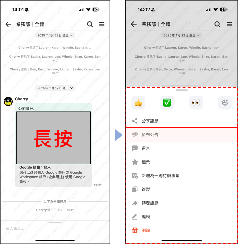 長按您要發布公告的訊息 > 點擊 [發布公告]。