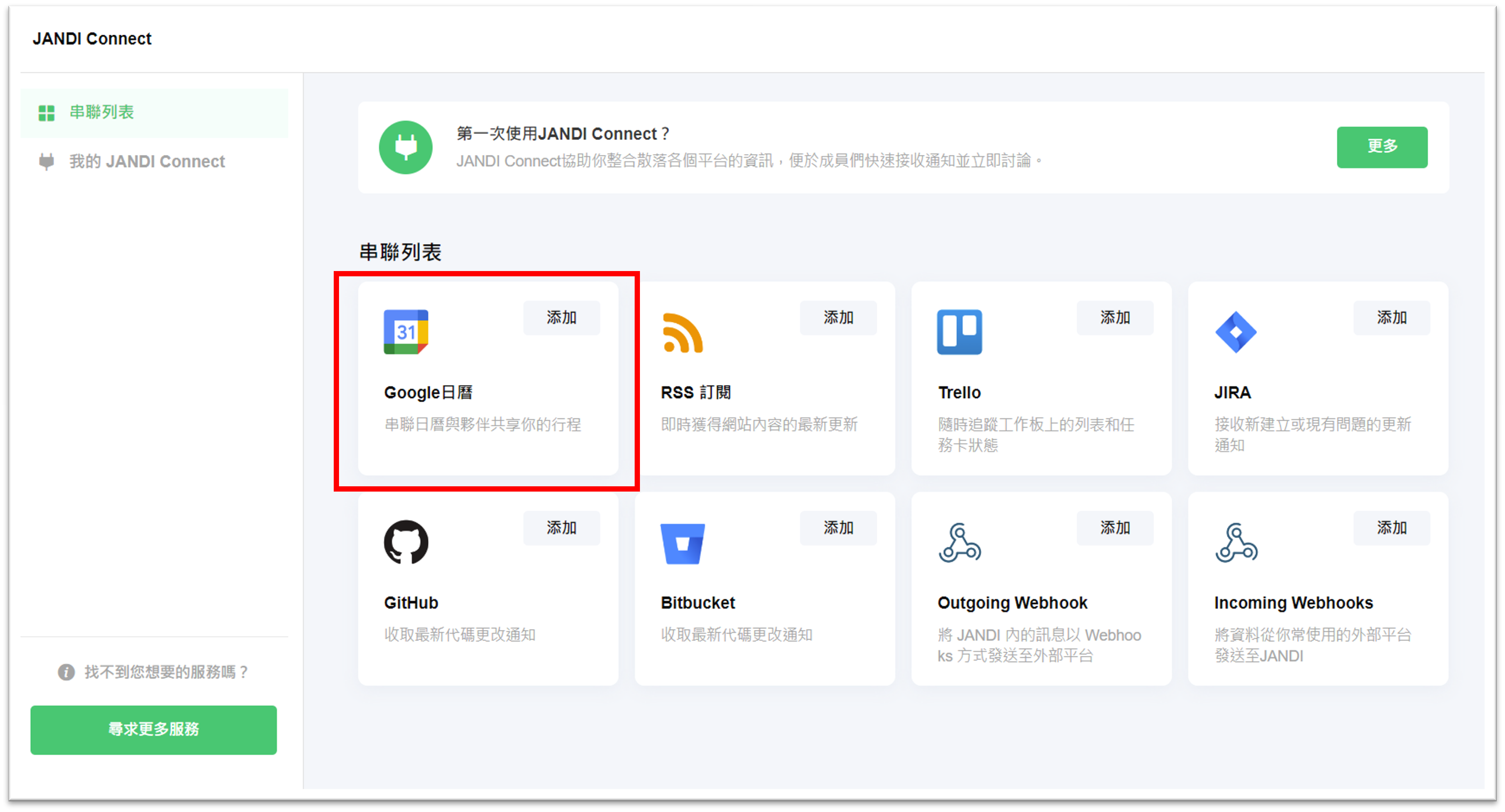 (點擊了解如何管理 JANDI Connect),進入串聯服務後,點選 Google 日曆的選項,並點擊添加。