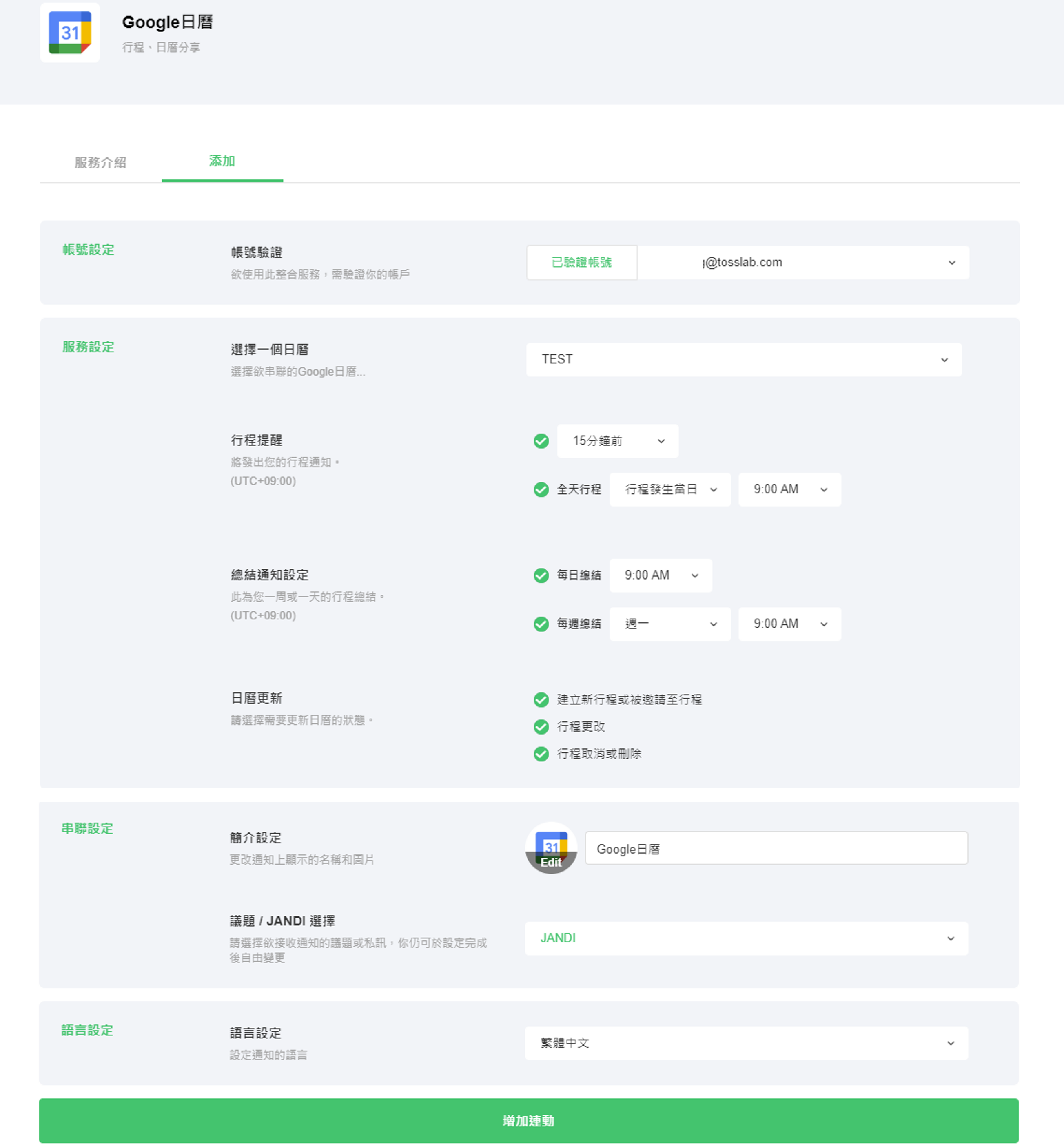確認欲串聯的帳號,選擇欲串聯的 Google 日曆,同時再選取欲接收通知的議題或私訊。