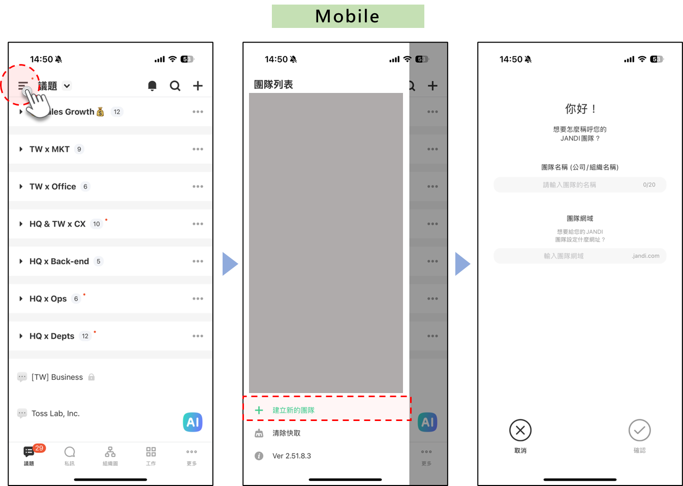 手機介面頂部左上 [≡] 圖示 > 點擊 [+建立新團隊] > 輸入名稱與網域 。