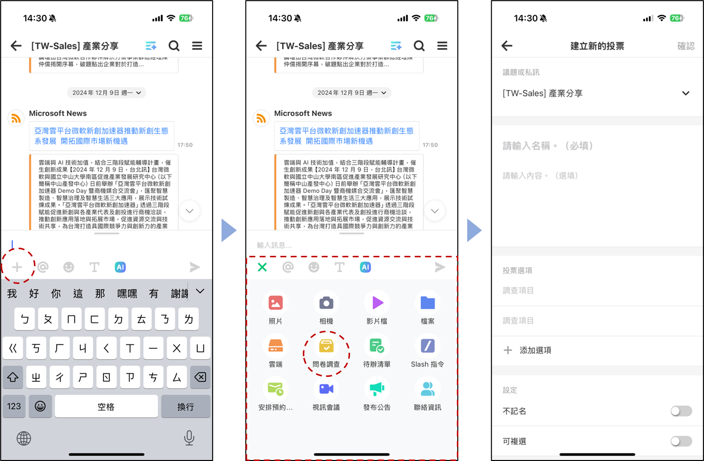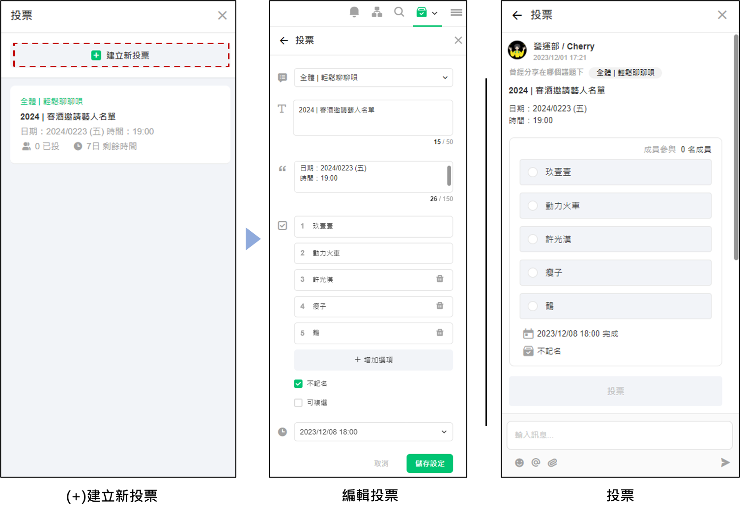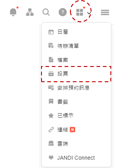 投票蒐集成員們的意⾒來加速決策,就可以利⽤ JANDI 投票功能。適用方案:FREE / PREMIUM / ENTERPRISEPC/WEBJANDI 右上角四個方格 [ 選單] > 投票也可以在議題輸入訊息框下,點擊[投票]圖示。建立新投票 > 將內容填寫 > 儲存設定Mobile操作方式:訊息欄選擇 (+) 圖示 > [問卷調查]使用須知一旦投票建立完成,您無法修改或編輯該投票項目。投票有誤,您可以修改您的投票。僅限在討論式議題