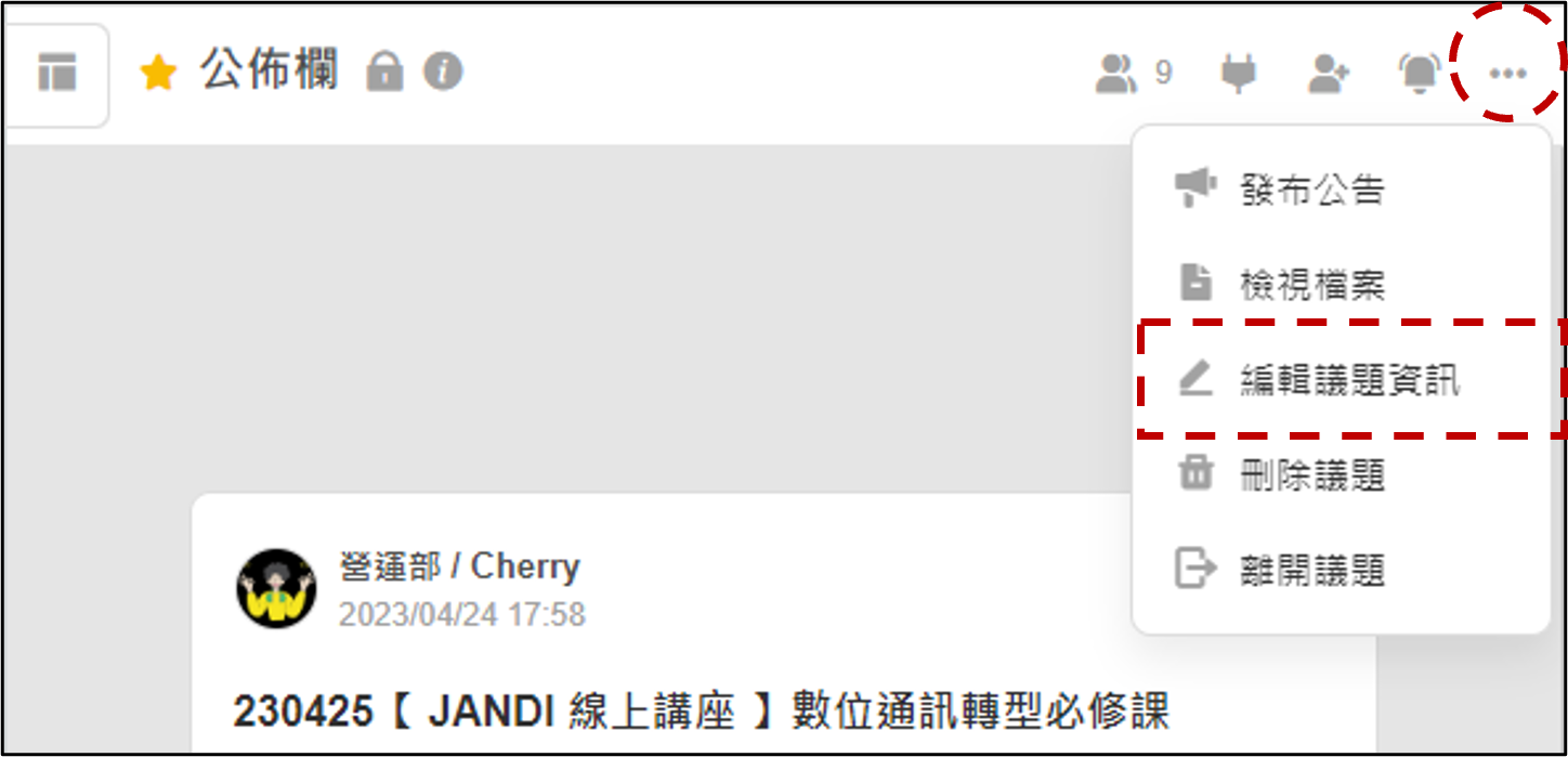 操作方式:在議題右上方 [...] > [編輯議題資訊]