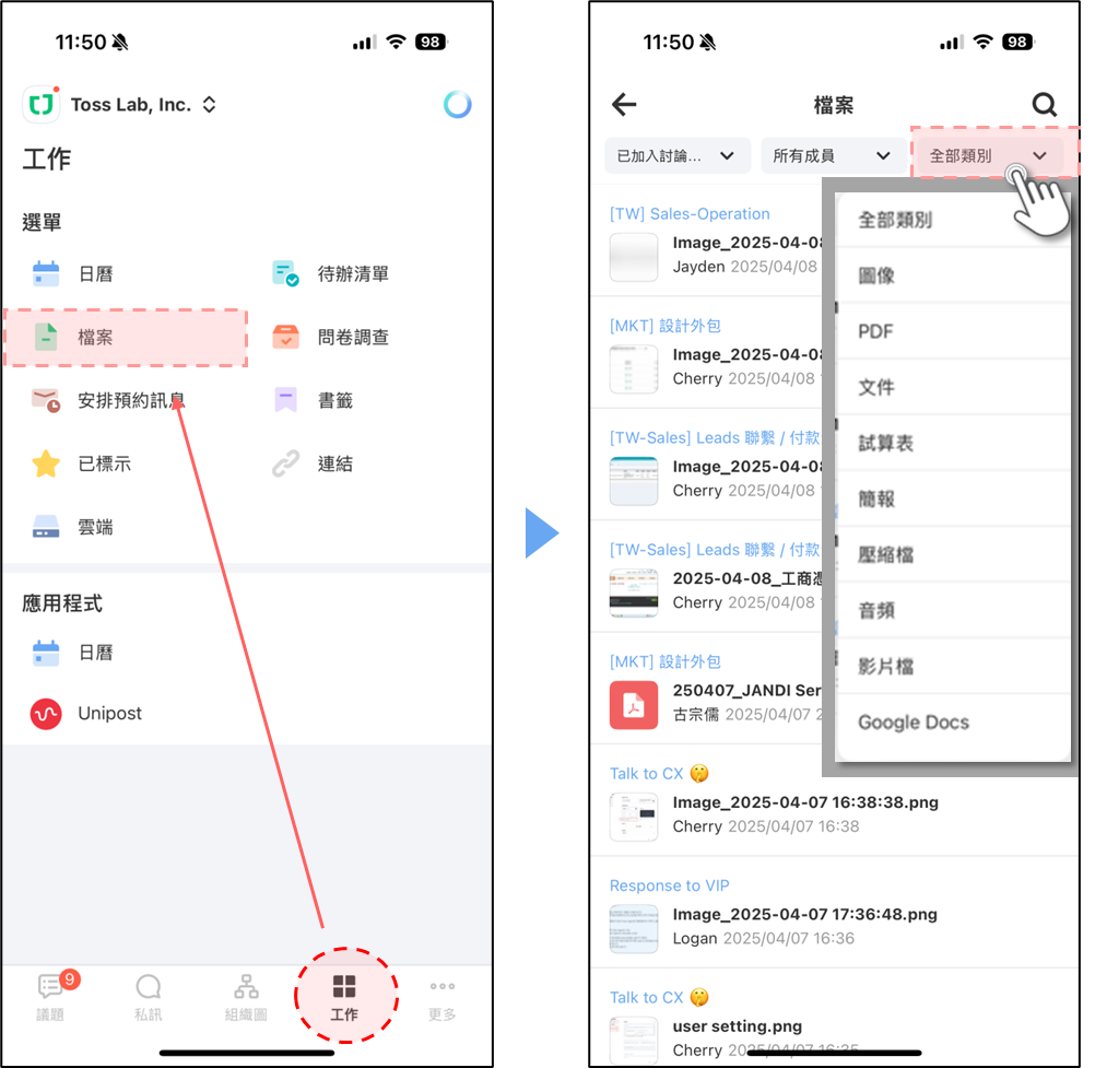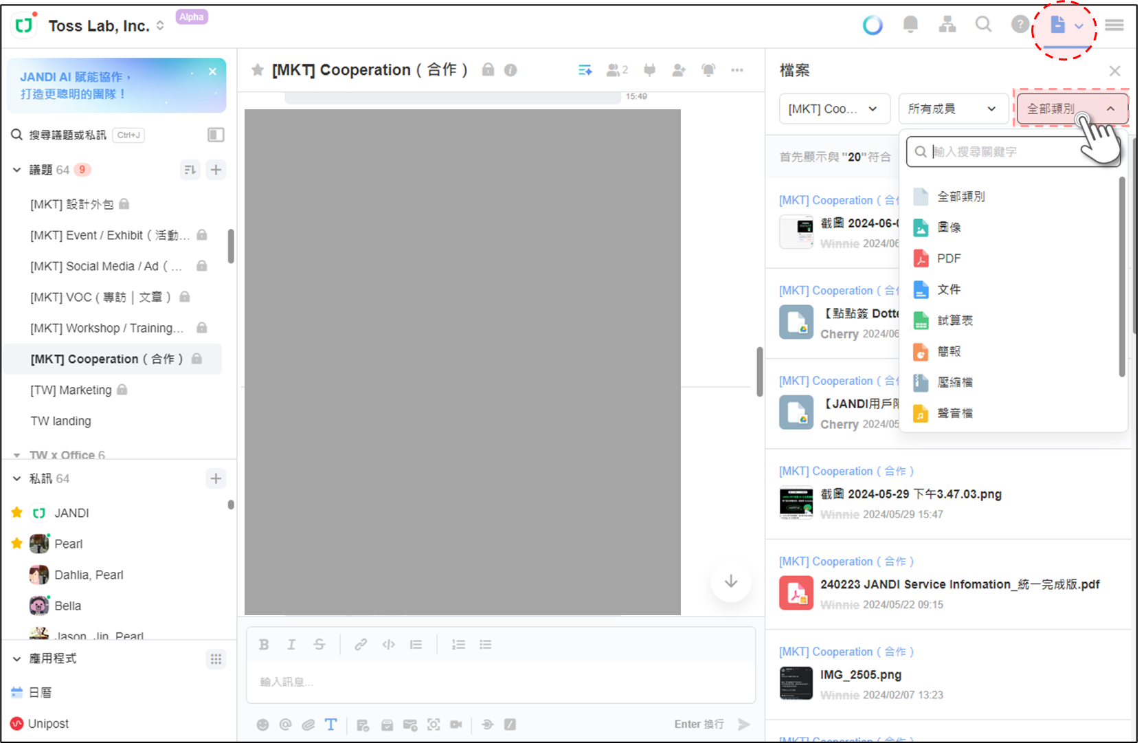 搜尋檔案利用 副檔名,快速找到檔案適用方案:FREE、PREMIUM、ENTERPRISE使用須知FREE 版本 只能回溯 90 天內 的歷史紀錄付費版本 可搜尋完整紀錄如何搜尋檔案PC/WEB點擊 JANDI 介面右上角的四格方塊圖示 > 檔案可透過 [篩選器] 進行進階搜尋:已加入的討論(議題或私訊)指定成員檔案副檔名Mobile進入 [工作] > [檔案]可透過 [篩選器] 進行進階搜尋:已加入的討論(議題或私訊)指定成員檔案副檔名