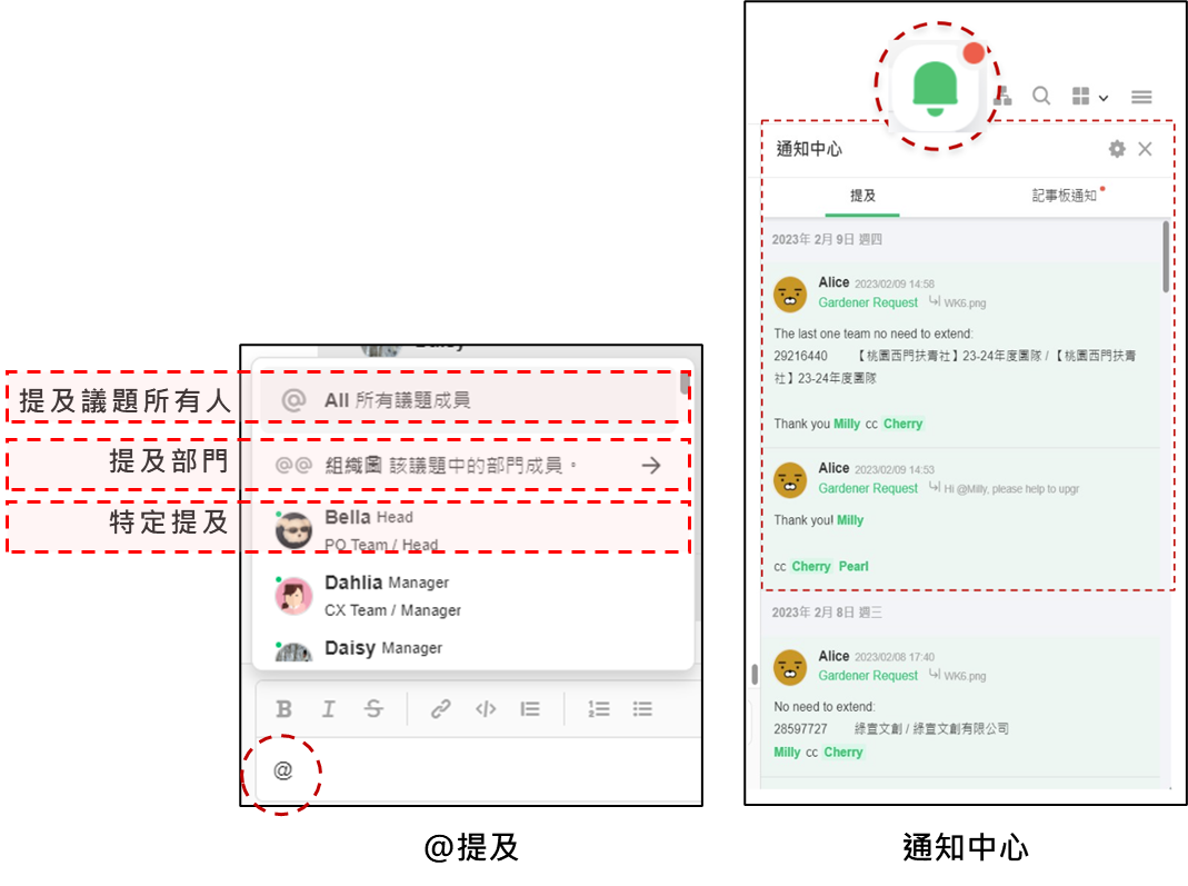 @ 提及功能,確保關鍵訊息不錯過!透過 @ 提及,您可以直接標註特定成員或全體成員,確保訊息即時通知對方,提升溝通與協作效率。
