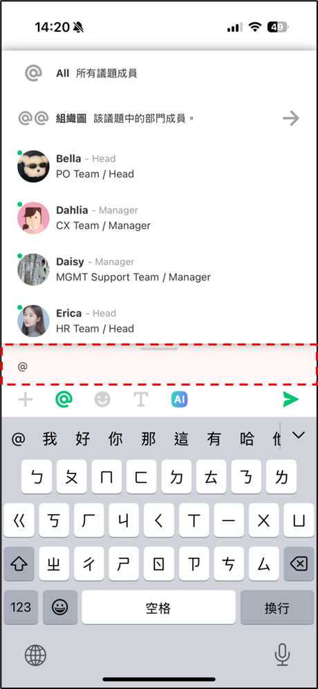 議題或私訊輸入 @符號,即可@提及