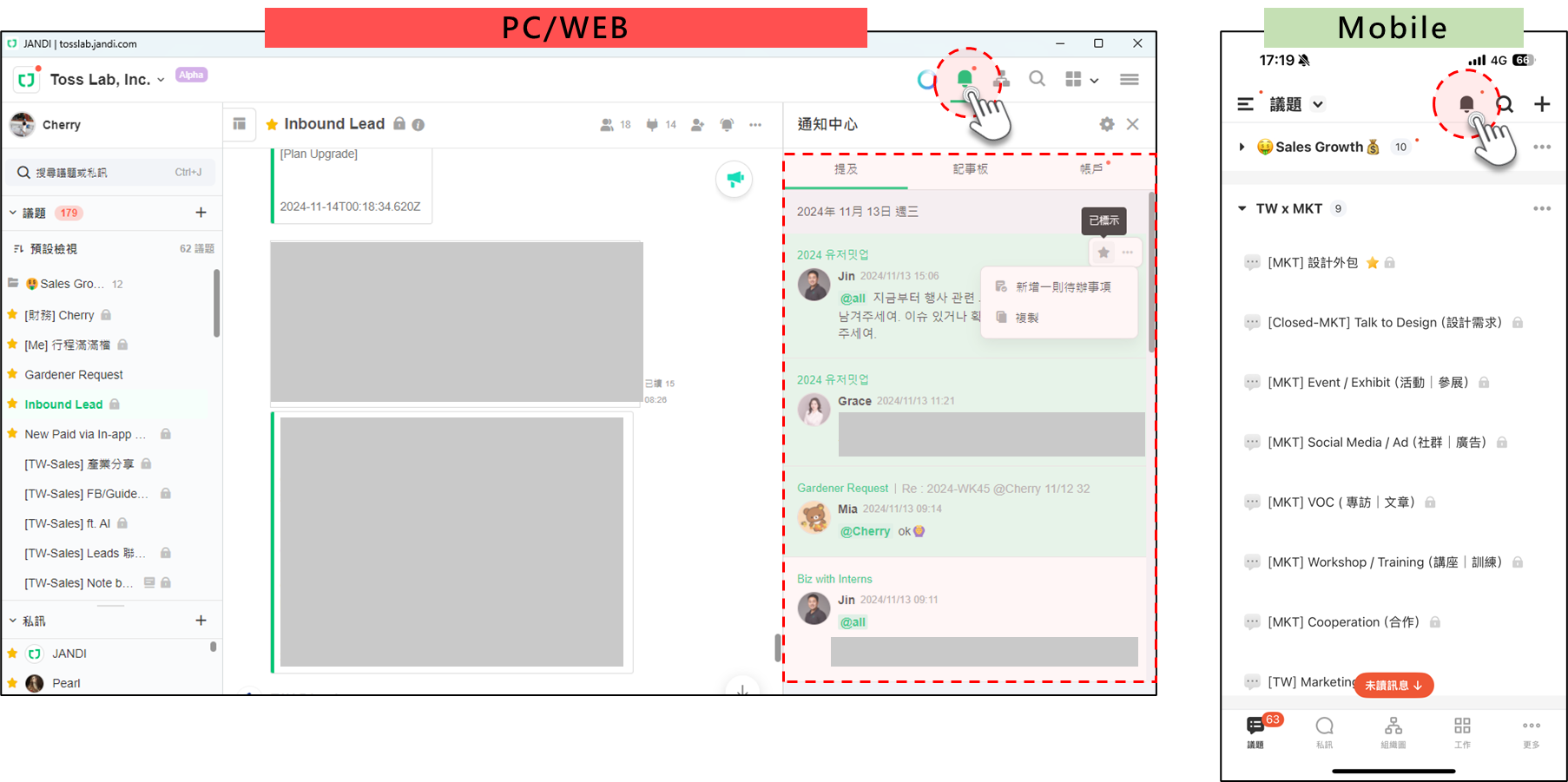 PC/WEB:點擊 右上角小鈴鐺 進入 [通知中心],即可查看所有被提及的訊息。
