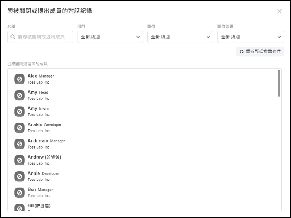 即使成員帳號已 關閉 或 退出團隊,仍可以查閱 歷史對話,但無法繼續發送新訊息。使用須知此功能 僅限桌機版 / 網頁版,行動版無法查看。無法發送新訊息,但仍可檢索與該成員的歷史對話內容。成員狀態(關閉 / 退出)將顯示於對話視窗中。<桌機版/網頁版>1. 在 私訊列表 中,點擊 (+) 圖示 > 選擇 [與被關閉或退出成員的對話紀錄]。2. 從列表中,選擇 已關閉或退出的成員 來查看歷史對話。