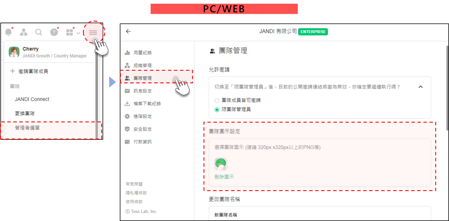 設定 [團隊圖示] 可以增強員工對公司的歸屬感,並增強團隊識別度。適用方案:FREE、PREMIUM、ENTERPRISE請留意:若要設定團隊圖示,請使用桌機版或網頁版 JANDI 操作。僅限團隊所有者/管理員可設定。若團隊沒有設置特定的 Logo,則預設圖示將為 JANDI 圖示。選擇團隊圖示 (建議 320px x320px以上的PNG檔)PC/Web介面右上方 [≡] 並選擇 [管理者選單] 團隊管理 > [團隊圖示設定]