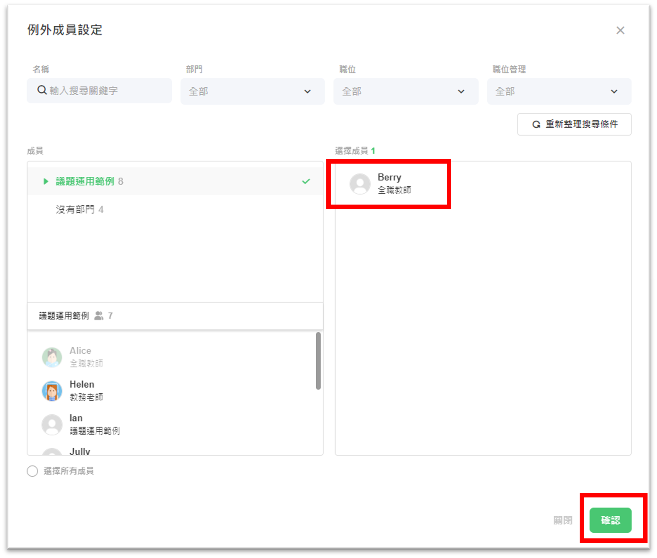 4. 如果點擊新增,您可以在組織圖中選擇一個成員。選擇成員後,點擊 [確認]