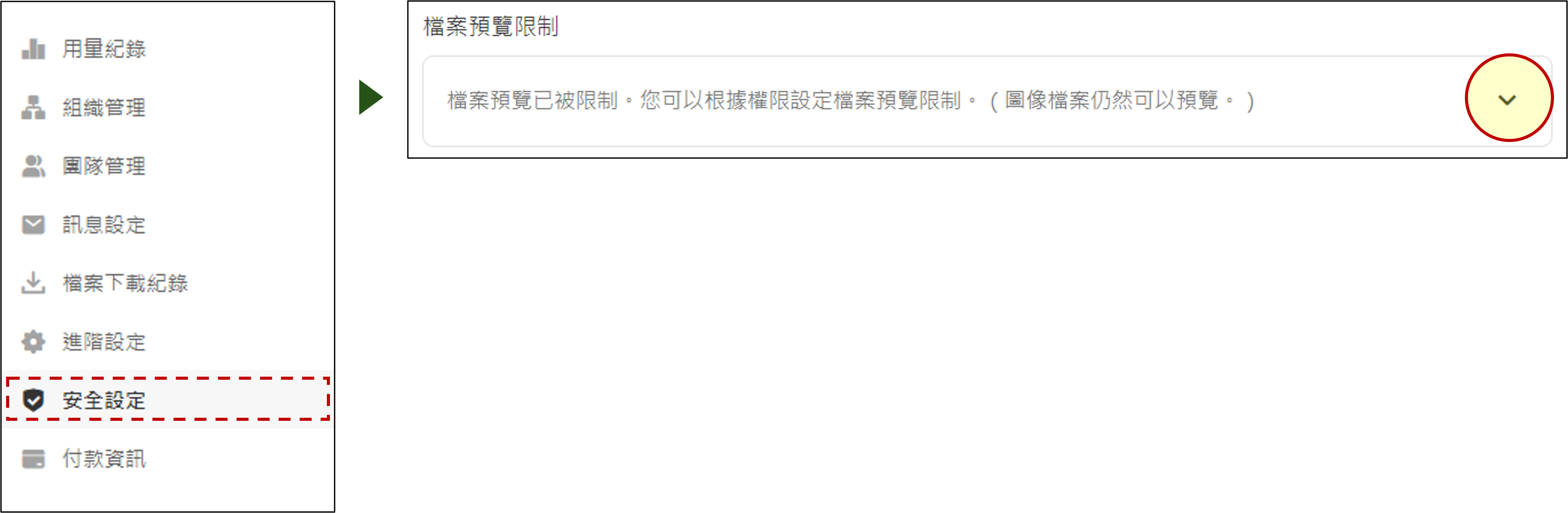 JANDI 右上角 [三] > 點擊 [管理者選單] > [安全設定] > [檔案預覽限制]。