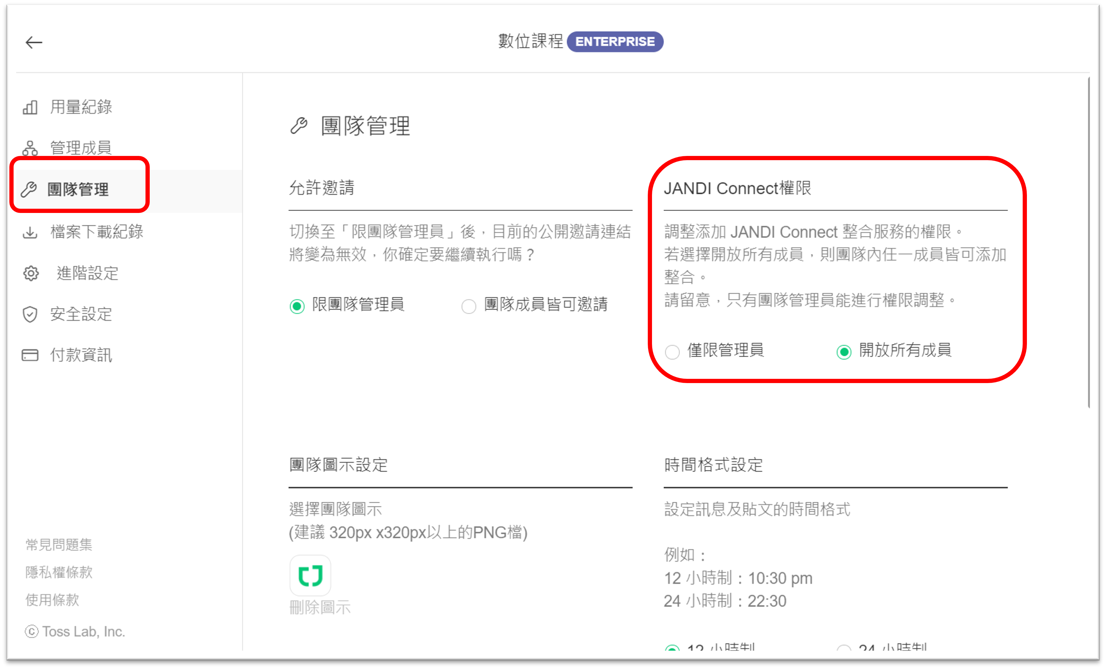 2. 轉到 [團隊管理] 選項卡片後,為 [JANDI Connect 權限] 選擇 [僅限團隊管理員]。