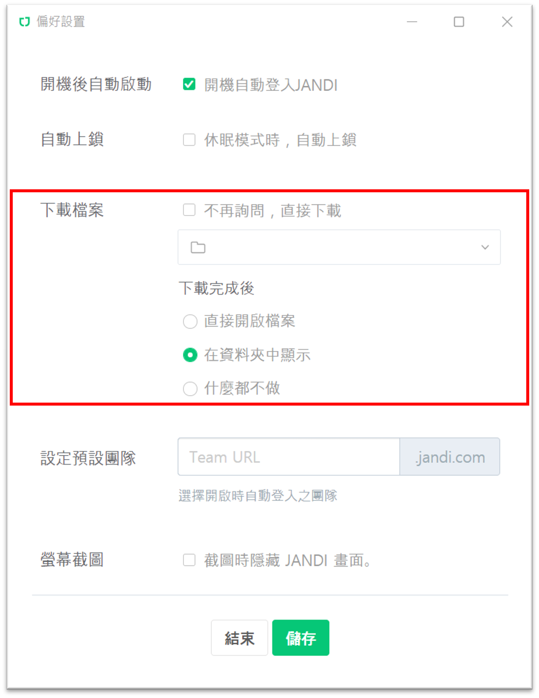 2. 於功能視窗中,選擇一個下載存取位置及下載完成後的動作。