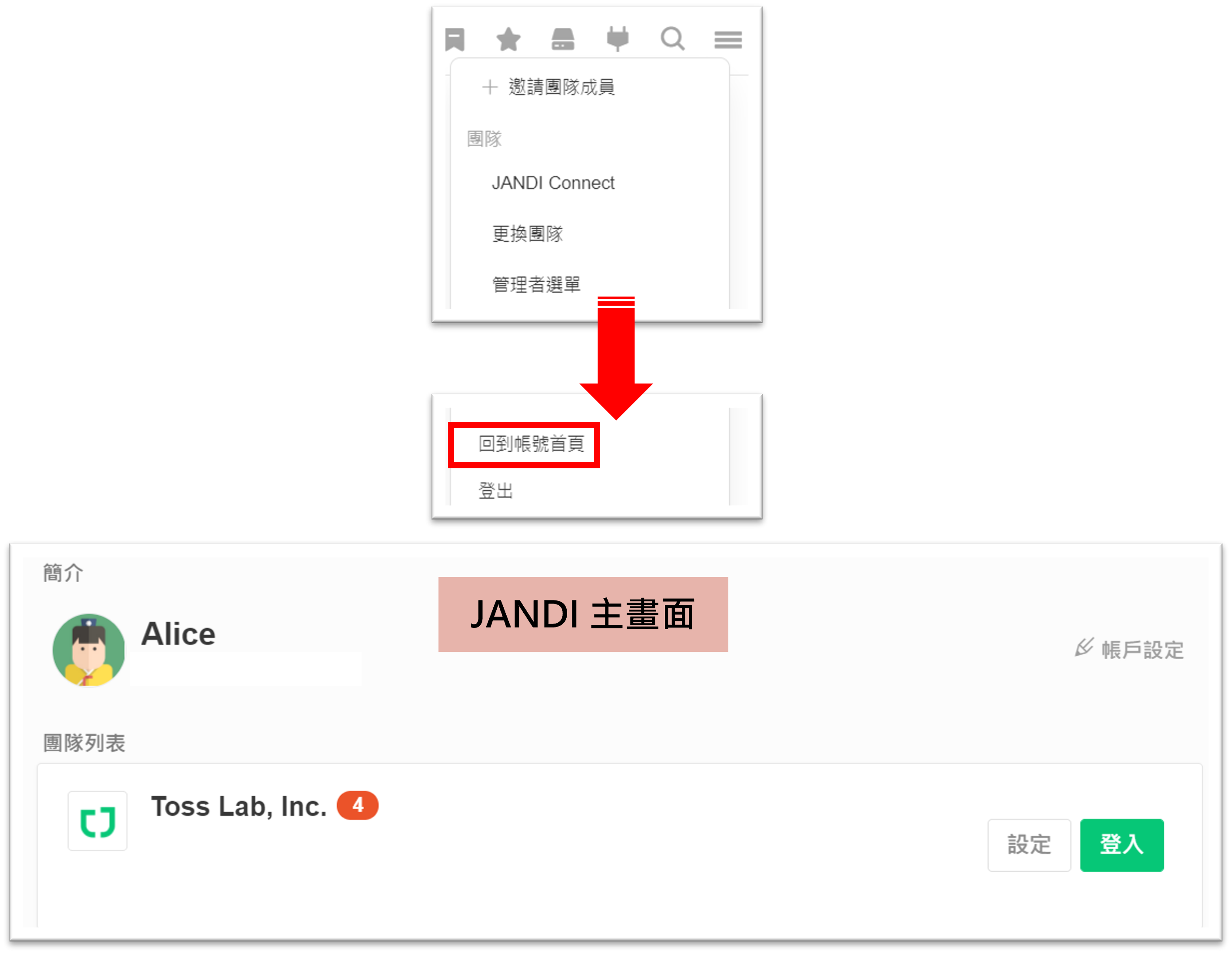 於JANDI介面右上方的 [≡] > [回到帳號首頁] > JANDI 主頁面 [帳戶設定]