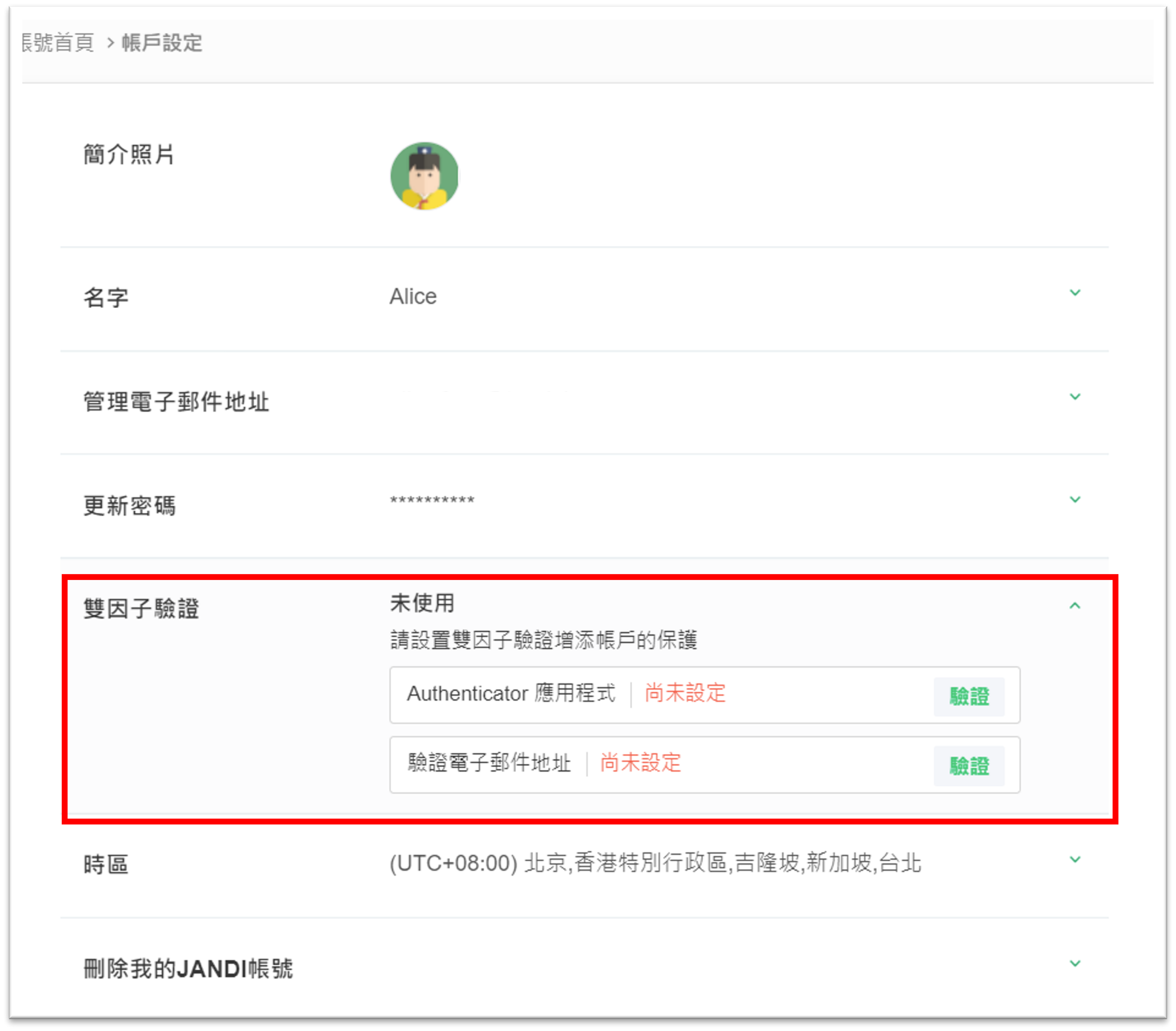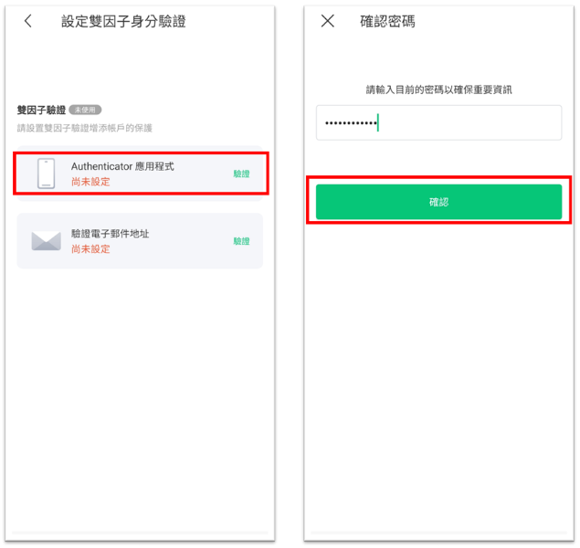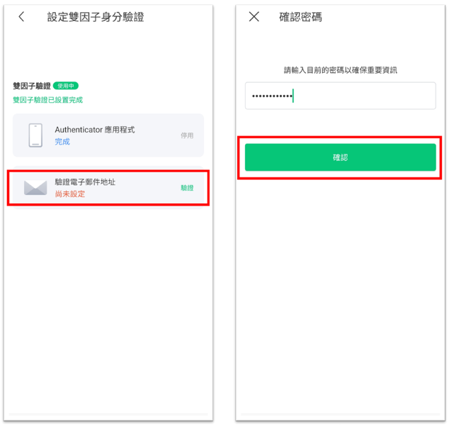 帳戶設定中的 [雙因子驗證] 方法有兩種:應用程式驗證 / 電子郵件驗證。