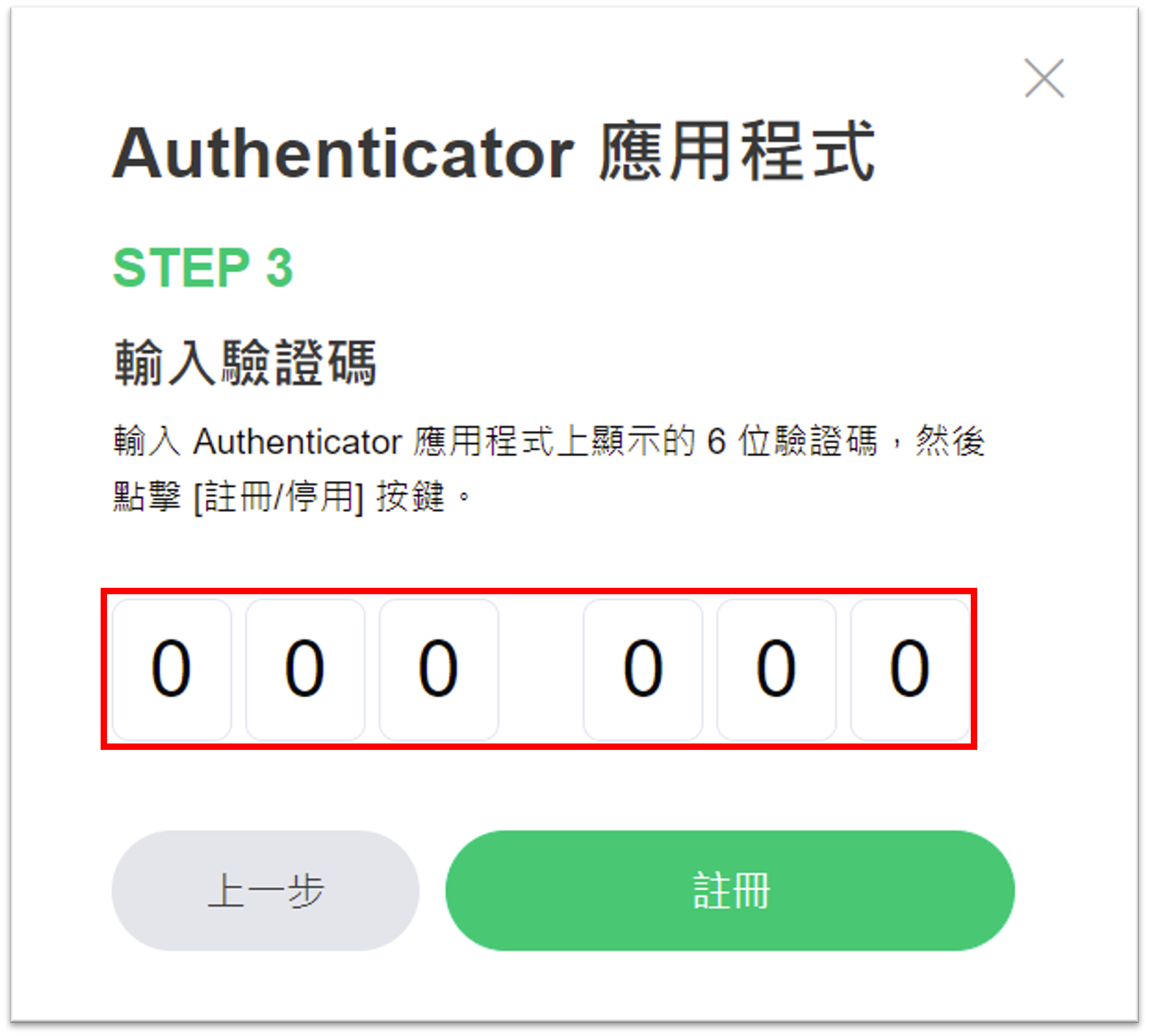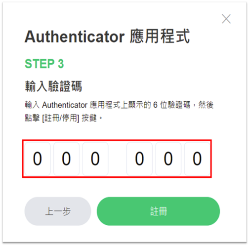 4. 於OTP應用程式輸入顯示的6位數驗證碼後,點擊[註冊]。