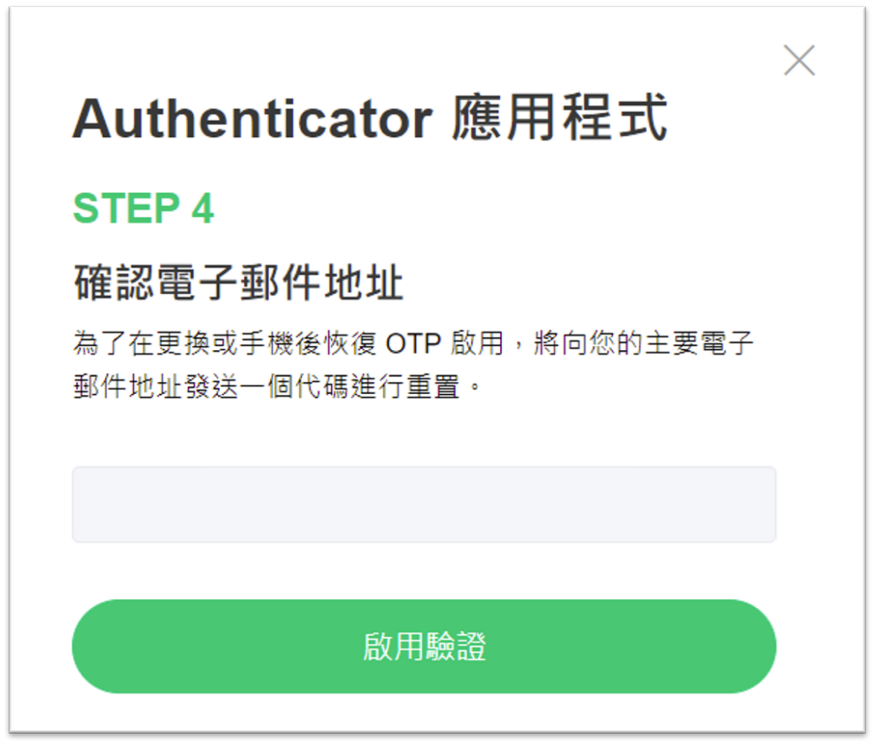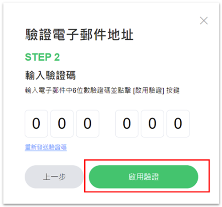 4. 於上方輸入電子郵件地址發送之6位數驗證碼後,點擊 [啟用驗證]。