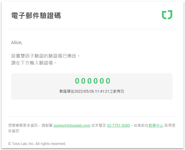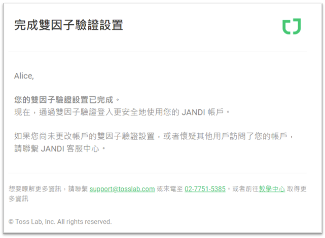 雙因子驗證設定後,將發送電子郵件通知已完成設定。