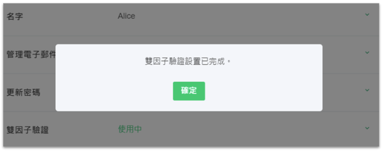 5. 雙因子驗證設定完成。