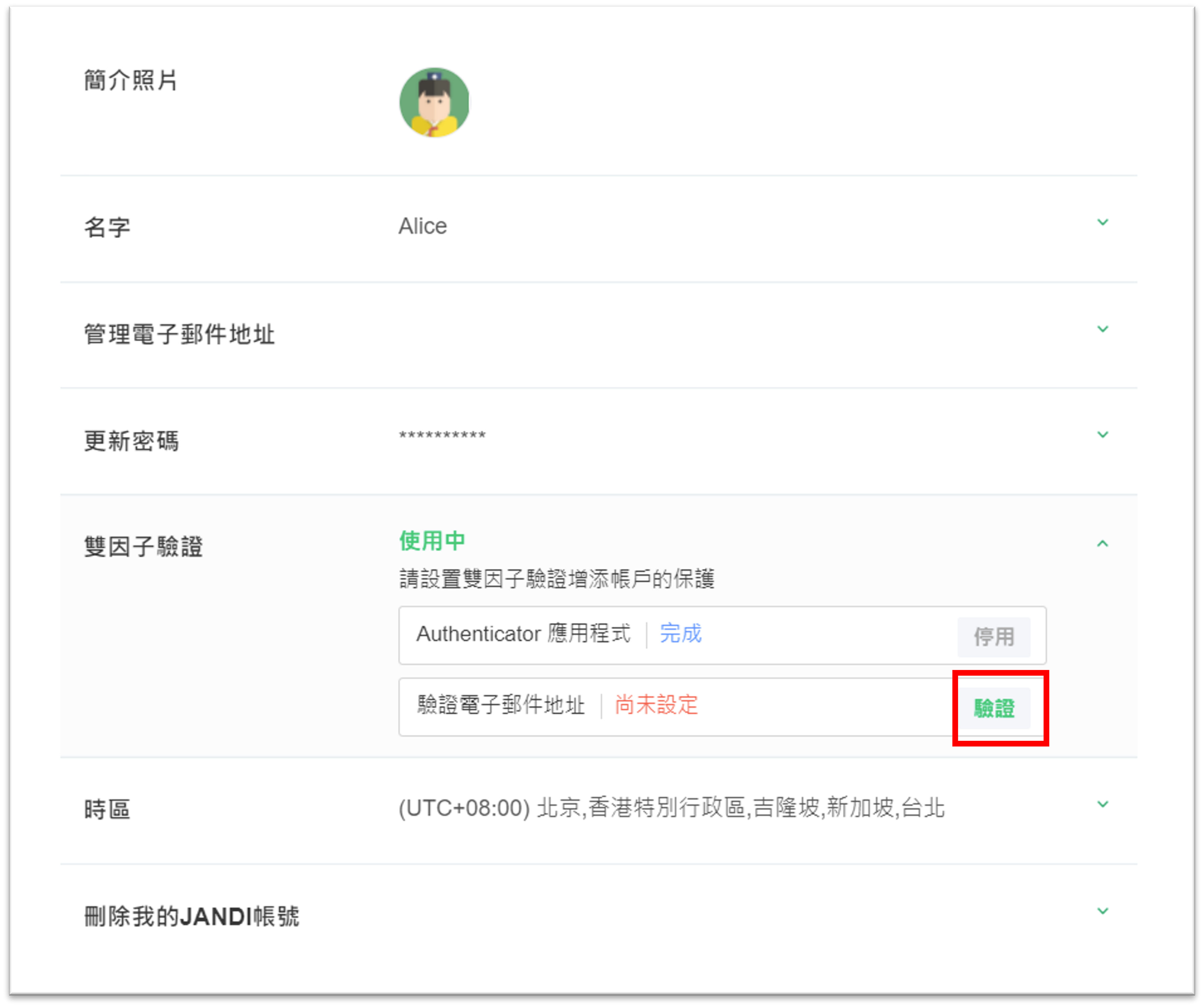 1. [雙因子驗證] 驗證電子郵件地址 > 請點擊 [驗證]。