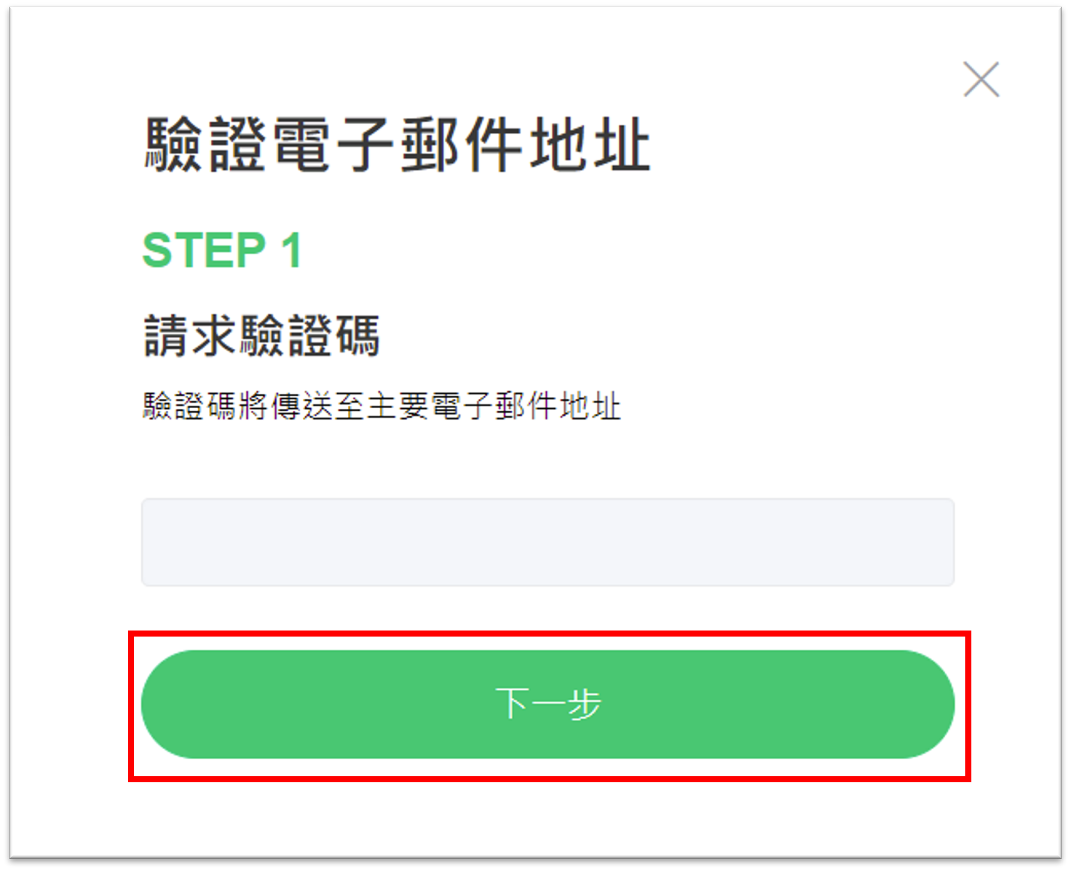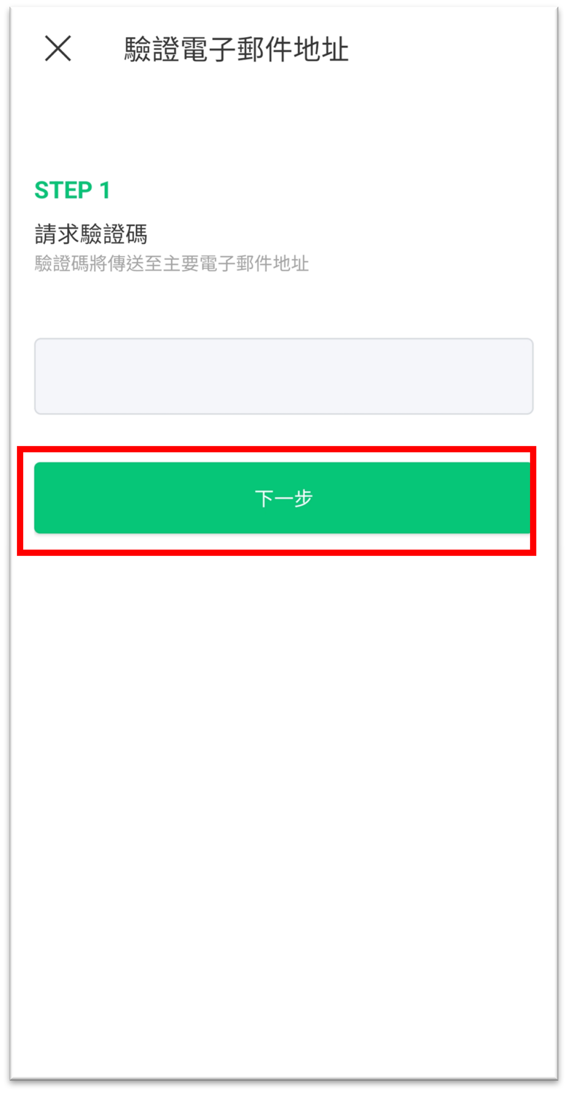 3. 驗證碼將透過帳號電子郵件發出。確認電子郵件地址後,請點擊 [下一步]。