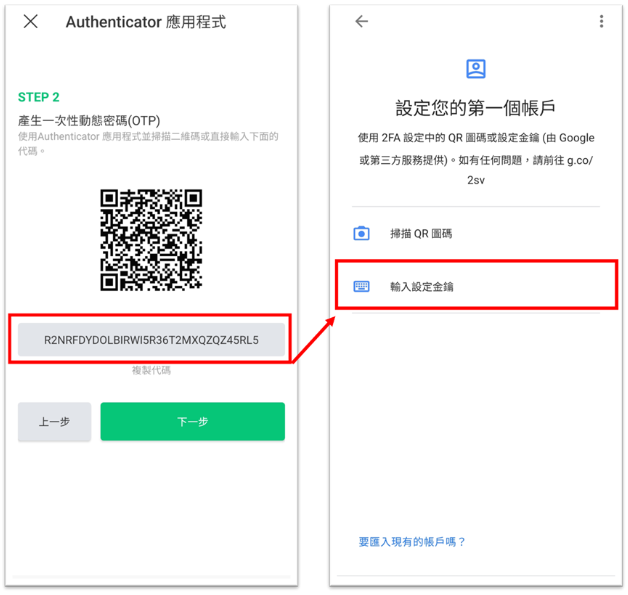 3. (1) 請輕觸畫面JANDI 應用程式畫面複製代碼。 (2) 點擊手機OTP應用程式的[輸入設定金鑰] , 將複製的代碼貼上。